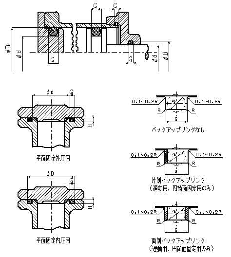 | Size | tolerance | Size | tolerance | No backup ring | One-sided backup ring | Double-sided backup ring | H}0.05 | Maximum value | |||